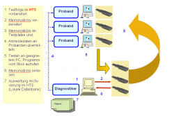 Am Administrationsplatz werden die Aufträge vorbereitet und auf einen USB-Stick kopiert. Man transferiert dann den USB-Stick zur Person, die zu diagnostizieren ist. Diese steckt den USB-Stick an ihrem PC ein und startet eine Applikation, wo nach der Anmeldung die vorgesehenen Tests bearbeitet werden. Nach Abschluss wird der USB-Stick wieder zurücktransferiert und am Administrationsplatz eingelesen. Das Ergebnis steht dort zur Verfügung. Ob man die Sticks per Post versendet oder in einem eigenen Testraum in PC einsteckt, ist dabei gleich. Technisch steht Portable Testing für HTS 4.5 oder HTS WE Commander zur Verfügung - also immer, wenn ein lokales Programm installiert ist.